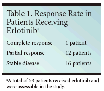 "Despite the favorable demographics,I think the response rate appearshigher than that observed in secondlinestudies," Dr. Perez-Soler said. Theimplication of the findings, he said, isthat as a single agent, erlotinib may beas active as the classical chemotherapyagents and could now be tested asfirst-line therapy in a phase III trialcomparing it with standard chemotherapyin selected patients.