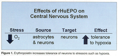"Some of the aspects of erythropoietin activity in the brain are similar to what occurs in the periphery," Dr. Brines explained. In its hormonal roles, EPO is produced by the kidney under hypoxic stress. In vitro studies conducted nearly a decade ago revealed that astrocytes removed from the brain make erythropoietin under stress. "Subsequent studies show that one principal target is neurons and the effect is to increase tolerance to the stressor, in this case, hypoxia," he added (see Figure 1). The erythropoietin gene and its receptor make up a signaling system that influences the gene expression program in specific neurons and responds to local ischemic stress.