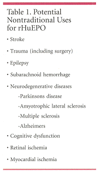 Studies suggest that rHuEPO may be useful in treating human disease (see Table 1, above), including stroke, trauma, epilepsy, subarachnoid hemorrhage, retinal ischemia, cognitive dysfunction, and myocardial ischemia. In addition to the reported studies with multiple sclerosis, "there are good in vivo and in vitro models for Parkinson’s disease and amyotrophic lateral sclerosis and an in vitro model for Alzheimer’s disease which is very encouraging," Dr. Brines said.
