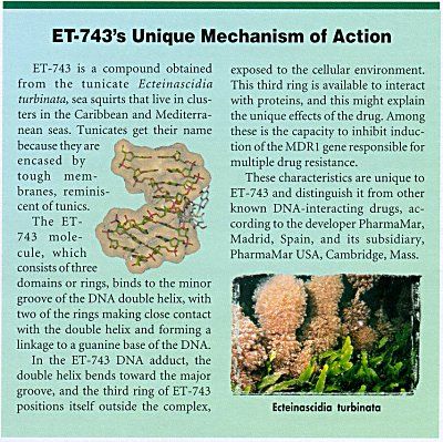NEW ORLEANSResults of three phase II trials suggest that ET-743 (ecteinascidin), a novel marine compound (see box at right), may have a role to play in treating certain soft-tissue sarcomas, George D. Demetri, MD, said at the 36th Annual Meeting of the American Society of Clinical Oncology (ASCO).