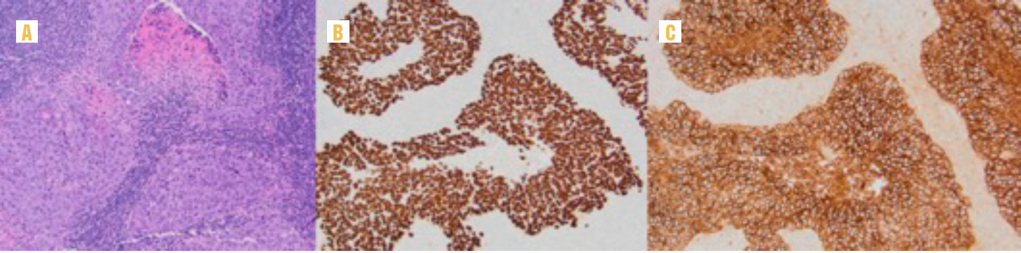 FIGURE 4. Additional Results (A) Hematoxylin and eosin stain (×100): Solid nests of malignant cells with synthetical growth pattern, prominent nucleoli, and tumor necrosis in a background of lymphoid tissue. (B) SALL4 immunostain stain (×100): Strong nuclear positivity. (C) CD30 immunostain stain (×100): Strong and diffusely membranous positivity.