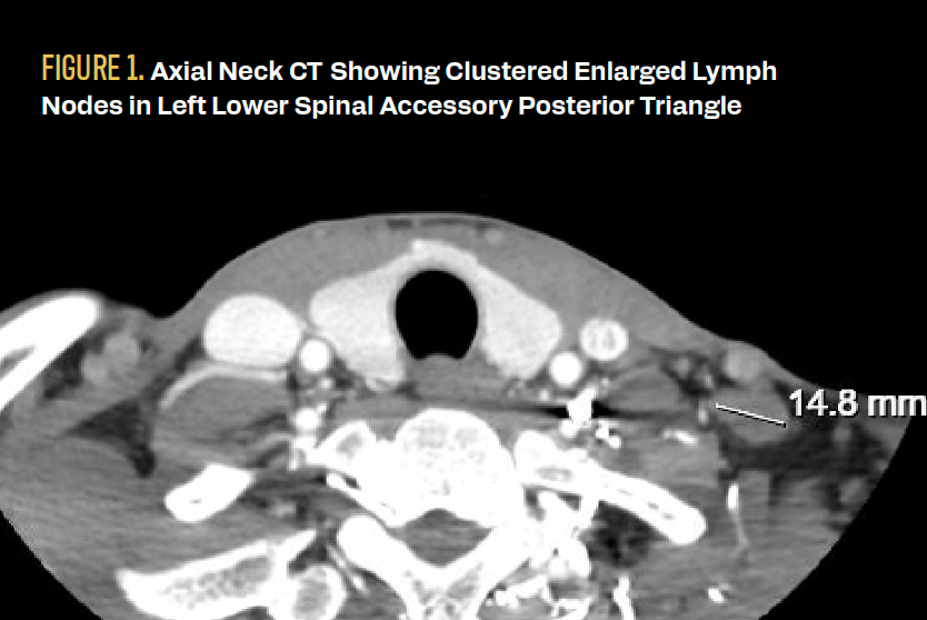 FIGURE 1. Axial Neck CT Showing Clustered Enlarged Lymph Nodes in Left Lower Spinal Accessory Posterior Triangle