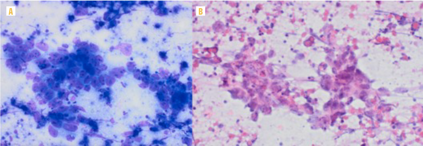 FIGURE 3. Staining Results (A) Diff-Quik stain (×20): Pleomorphic malignant cells with large irregular nuclei, coarse chromatin, prominent irregular nucleoli, vacuolated cytoplasm, and indistinct cell borders (syncytial growth pattern). (B) Papanicolaou stain (×20): Syncytial cluster of pleomorphic malignant cells with coarse chromatin and prominent nucleoli in a background of necrotic debris.
