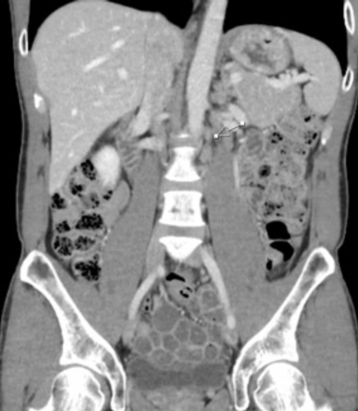 FIGURE 2. Coronal CT Abdomen and Pelvis Showing Several Foci of Periaortic Lymphadenopathy