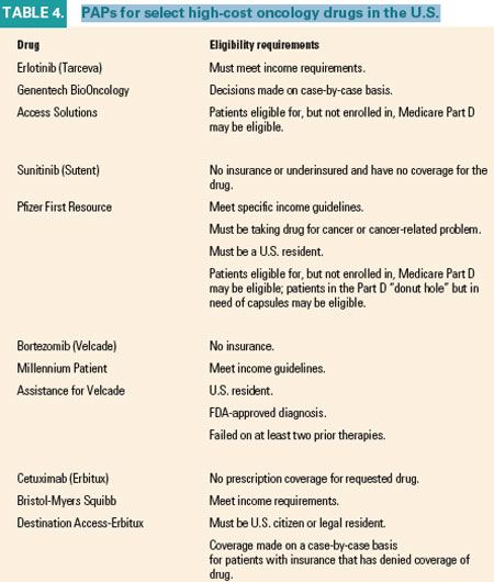 In addition to all of these programs are the patient assistance programs (PAPs) through the pharmaceutical companies. Many of these programs will waive the cost of drugs for patients in need, provided they meet specific criteria (see Table 4).