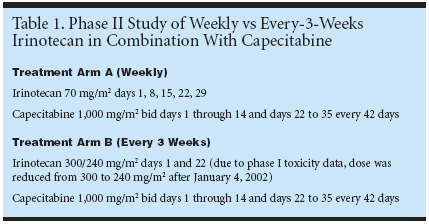BERN, Switzerland-A study ofcapecitabine (Xeloda) and two differentschedules of administration of irinotecan(CPT-11, Camptosar) as first-line therapyfor patients with metastatic colorectalcancer found that a 3-week scheduleachieved better response than a 1-weekschedule, with reduced toxicity. The resultswere reported by Markus Borner,MD, associate professor, Institute of MedicalOncology, Inselspital, Bern, Switzerland(ASCO abstract 1068).Adding irinotecan to fluoropyrimidinesis a new standard in the treatmentof metastatic colorectal cancer. Accordingto Dr. Borner, "Well tolerated combinationregimens have used irinotecan incombination with infusional fluorouracil(5-FU) plus leucovorin. Oral capecitabinemight be more convenient than infusionalfluorouracil. Furthermore, preliminarystudy results suggest that thecombination of capecitabine and irinotecanis feasible. However, irinotecan canbe administered in different schedules andit is not clear which schedule is the mostadvantageous in combination withcapecitabine."Objectives and End PointThe primary objective of the study wasto compare the efficacy of different irinotecanschedules in combination withcapecitabine in chemotherapy-naive metastaticcolorectal cancer patients. The mainend point of this study was the objectivetumor response rate. The secondary objectiveswere to assess toxicity, time totreatment failure, time to progression, andoverall survival associated with the twodifferent schedules."We performed an exploratory phaseII study comparing weekly irinotecan to3-weekly irinotecan in combination withcapecitabine," Dr. Borner explained (Table1). In treatment arm A, irinotecan wasadministered every week at a dose of 70mg/m2 on days 1, 8, 15, 22, and 29. Intreatment arm B, irinotecan was givenevery 3 weeks at a dose of 300/240 mg/m2on day 1 and day 22. Both arms receivedcapecitabine 1,000 mg/m2 twice daily ondays 1 to 14 and days 22 to 35 every 42days. Because of newly available phase Itoxicity data, the irinotecan dose in treatmentarm B was reduced from 300 to 240mg/m2 after January 4, 2002.