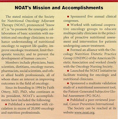 PHILADELPHIAThe Society for Nutritional Oncology Adjuvant Therapy (NOAT) is an interdisciplinary professional organization that addresses the role of nutrition and metabolism in oncology. Founded in 1994, NOAT is the first organization devoted solely to studying the role of nutrition in cancer (see box).