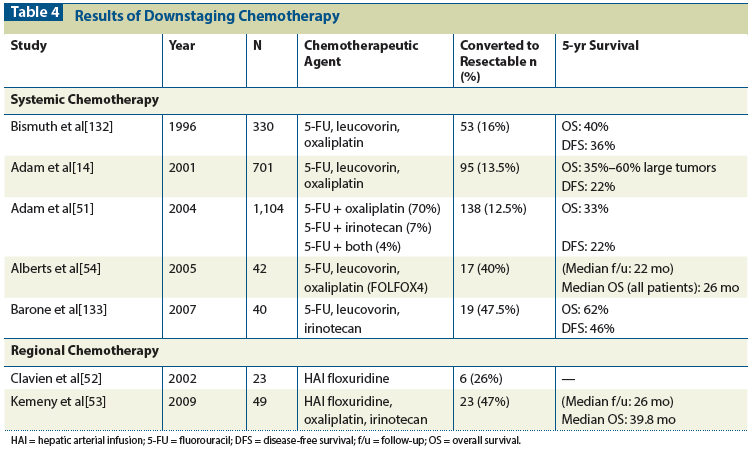 Bismuth et al[50] ï¬rst reported that oxaliplatin-based chemotherapy may convert nonresectable disease to resectable. Since then, there have been many reports of the use of FOLFOX or FOLFIRI chemotherapy to convert disease to resectable.[14,50-54] In approximately 15% of patients treated with systemic chemotherapy, the disease converts to “resectable” status. Regional chemotherapy using HAI FUDR is particularly impressive in its ability to convert unresectable disease to resectable. Clavien et al[52] reported a conversion rate of nearly 30% for regional HAI FUDR, whereas Kemeny et al[53] reported a rate of > 50% for a regimen that combined HAI FUDR with systemic FOLFOX (Table 4).