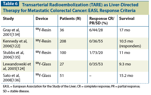 When used appropriately, radioembolization effectively treats many different types of liver cancer. It clearly can produce a tumor response when delivered as a treatment for metastatic colorectal cancer (Table 6)[121-124] and can even produce sufficient shrinkage of tumors to downstage unresectable cases to resectable.[125] The precise roles of this promising brachytherapy technique in the treatment of patients with resectable and unresectable disease still await the results of trials such as the ongoing SIRFLOX (FOLFOX Plus SIR-Spheres vs FOLFOX Alone in Patients With Liver Metastases From Primary Colorectal Cancer) and FOXFIRE (5-Fluorouracil, Oxaliplatin, and Leucovorin With or Without Radioembolization) studies, which are comparing the use of chemotherapy with and without 90Y in the treatment of nonresectable colorectal metastases.