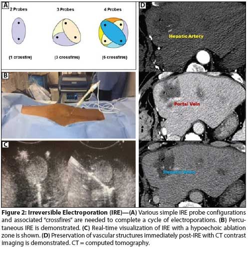 Irreversible electroporation. IRE (Nanoknife) is a relatively newer technology that uses a nonthermal electrical current to elicit its cytotoxic effect. In IRE, a series of rapid microsecond to millisecond pulses of high energy (1,000–2,500 V/cm2) direct current (70–90 pulses) are transmitted along electric fields between parallel electrodes placed 1 to 2 cm apart. This causes irreversible damage in the form of permanent nanopores within the cellular membrane, with subsequent cell death through cellular apoptotic pathways.[71-73] Because IRE is essentially nonthermal,[74,75] it is not as susceptible to heat sink effects involving nearby vessels. Furthermore, since there is very little scarring and no significant thermal injury to extracellular components, it can be used with relative safety on tumors adjacent to heat-sensitive structures, such as vessels, bile ducts, and nerves (Figure 2).[76,77]