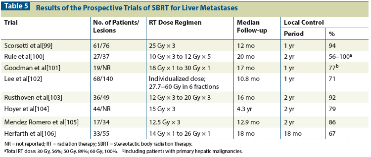 103. Rusthoven KE, Kavanagh BD, Cardenes H, et al. Multi-institutional phase I/II trial of stereotactic body radiation therapy for liver metastases. J Clin Oncol. 2009;27:1572-8.
