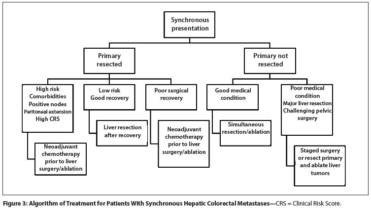 For patients with colorectal cancer who present with synchronous liver metastases, an algorithm of care is shown in Figure 3. If the patient has synchronous primary and metastatic disease that can be safely removed in the same operation, a combined resection is justiï¬ed.[127,130] If the primary colorectal cancer has already been removed, delay in resection of the liver metastases is medically justified for recovery from the primary resection or if the patient’s comorbidities dictate optimization of medical condition.