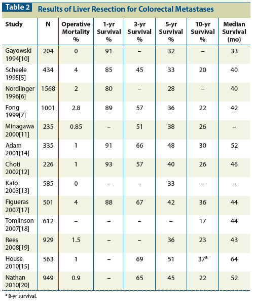 Encouraged by autopsy studies demonstrating that metastatic disease may be confined to the liver and by radiologic documentation of disease confined to the liver in many cases, surgeons increasingly began to resect hepatic colorectal metastases.[5-7] A large body of data has accumulated during the past decades proving that surgical resection is safe and effective therapy (Table 2).[5-20] In general, operative mortality at major centers is less than 5%, and 5-year survival can be achieved in more than one-third of patients. An interesting study with complete 25-year follow-up of patients treated by liver resection by one of the pioneers in the field has demonstrated that surgery alone can provide a cure in approximately 20% of patients.[21] Patients also recover quickly and return to normal life.[22] These results can be accomplished during short hospital stays of 5 to 10 days.[11-14] Because of these data, liver resection has become the standard of care for patients with hepatic colorectal metastases.
