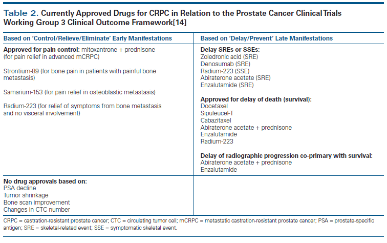 Table 2. Currently Approved Drugs for CRPC in Relation to the Prostate Cancer Clinical Trials Working Group 3 Clinical Outcome Framework[14]