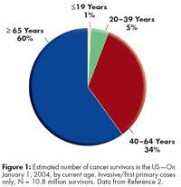 A second trend is related to changes in the age distribution of our population. In 1990, approximately 40% of the population was younger than age 35. By 2010, the majority of the population will be age 45 or older. Cancer occurs more commonly among older adults, and with greater numbers of people receiving cancer diagnoses and treatment, the percentage of survivors in this age-group has increased. In fact, 60% of cancer survivors are aged 65 years or older (see Figure 1).
