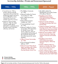 The Centers for Disease Control and Prevention and the LAF jointly released the National Action Plan for Cancer Survivorship: Advancing Public Health Strategies in 2004, spearheading a public effort to comprehensively address the needs and concerns of cancer survivors.[24] The plan represents the combined efforts of nearly 100 experts in public health and cancer survivorship. It identifies and prioritizes 23 needs in the realm of survivorship and suggests approaches for addressing these needs in four core public health domains: surveillance and applied research; communication, education, and training; programs, policies, and infrastructure; and access to quality care and services. This plan helped advance the survivorship movement by delineating how coordinated public health initiatives can be used to ultimately improve the well-being and quality of life of cancer survivors.