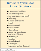 • Monitor physical health. Periodic assessment can detect signs or symptoms of recurrence, long-term or late effects, new primaries, and comorbidities.[6] Assessment should include a comprehensive medical history with a cancer-focused review of systems. (See sidebar, “Review of Systems for Cancer Survivors.”)