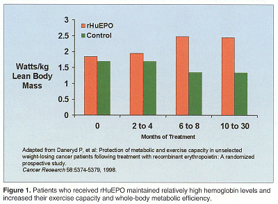 Despite being "somewhat complicated by a huge drop-out rate," the results clearly showed that hemoglobin levels and exercise capacity continued to drop in patients who did not receive rHuEPO, while patients who received it maintained relatively high hemoglobin levels of about 13 g/dL and increased their exercise capacity (see Figure 1). "The conclusion was that anemia is effectively overcome by rHuEPO in unselected cancer patients. Treatment of anemia preserved physical function, defined as exercise power and whole body metabolic efficiency," Dr. Evans said. "There is a remarkably strong relationship between change in VO