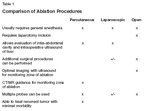 The decision to perform percutaneous, open, or laparoscopic ablation is based on known advantages of each technique (Table 1). Although percutaneous interventions do not require a laparotomy incision, most procedures require general anesthesia. Radiofrequency ablation causes severe pain during current application, but cryoablation is virtually painless after the probes have been introduced. There are anecdotal reports of only minimal pain associated with microwave ablation, but to our knowledge a clinical trial quantifying this effect has not yet been published.
