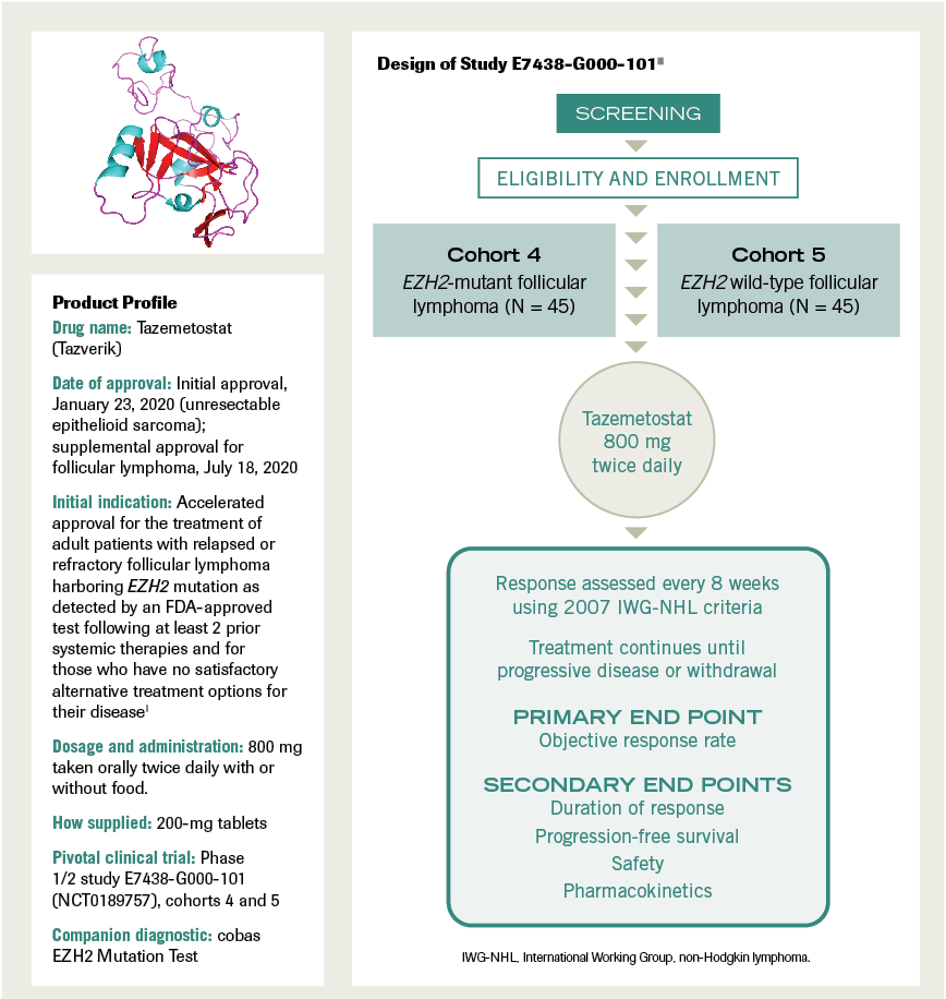 2. Morschhauser F, Tilly H, Chaidos A, et al. Tazemetostat for patients with relapsed or refractory follicular lymphoma: an open-label, single-arm, multicentre, phase 2 trial. Lancet Oncol. 2020;21(11):1433-1442. doi:10.1016/S1470-2045(20)30441-1