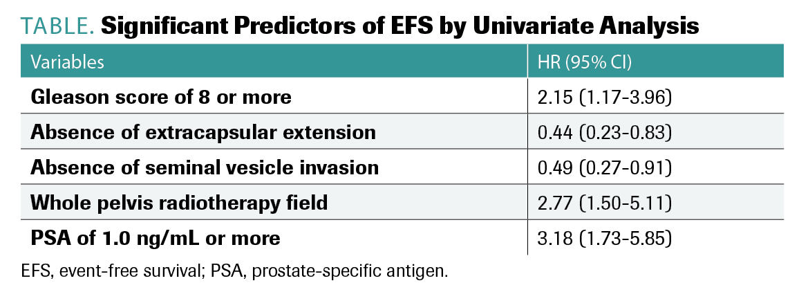 Variables found to be significant predictors of EFS by univariate analysis included Gleason score greater than 8, absence of extracapsular extension, absence of seminal vesicle invasion, whole pelvic treatment field, and PSA levels of 1.0 ng/mL or more (TABLE).
