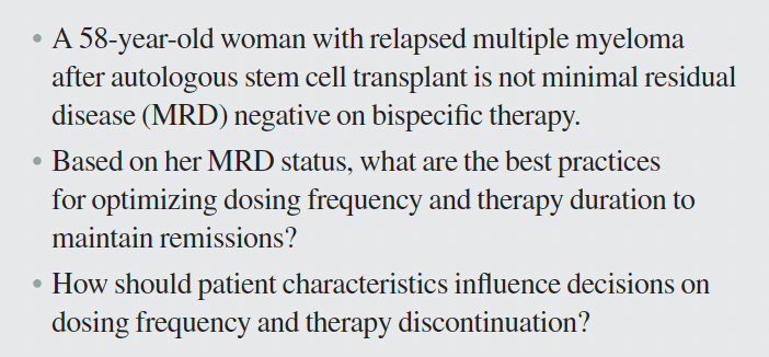Faiman / That was great, but I have to remind you of one thing. You can’t give a bispecific unless you’re [in] the third or more lines of therapy. CARTITUDE-4 showed us that you can give a CAR T-cell therapy in earlier lines, and that was a far more improved PFS and overall survival than any of the other regimens. Giving CAR T in earlier lines of therapy so you’re not having that attrition—you’re not losing that ability to give that CAR to that person, and then in later lines of therapy, you have that long journey to get that patient [prepared for us] to harvest the T cells, get the approval of the insurance. If you’re a community [physician], refer your patient to a CAR T center as early as possible, get that CAR T as soon as you can. We also saw from other studies that you can still have a CAR T. We were just talking in that prior study you could have a CAR T, and it didn’t affect your response when we had the combination study.