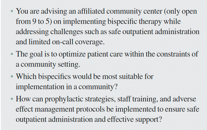 Atrash / That’s a great discussion. The future for bispecifics is [for it] to be given as outpatient. I hope everybody agrees to that. We just have to figure out the optimal regimen [because] that seems like prophylactic tocilizumab is one way to do it. Also providing local lodging around the step-up dosing or closer to the hospital that is doing step-up dosing is another suitable option. There are the prophylactic strategies; that’s where we have to collaborate with our colleagues locally by giving the best supportive care. Infection down the road is what we worry about. Whether it’s a growth factor, IVIG Bactrim, or pentamidine, those are important medications to help us avoid infections down the road. We should be very cognizant of opportunistic infections, and if a patient has persistent fevers, ask for help.