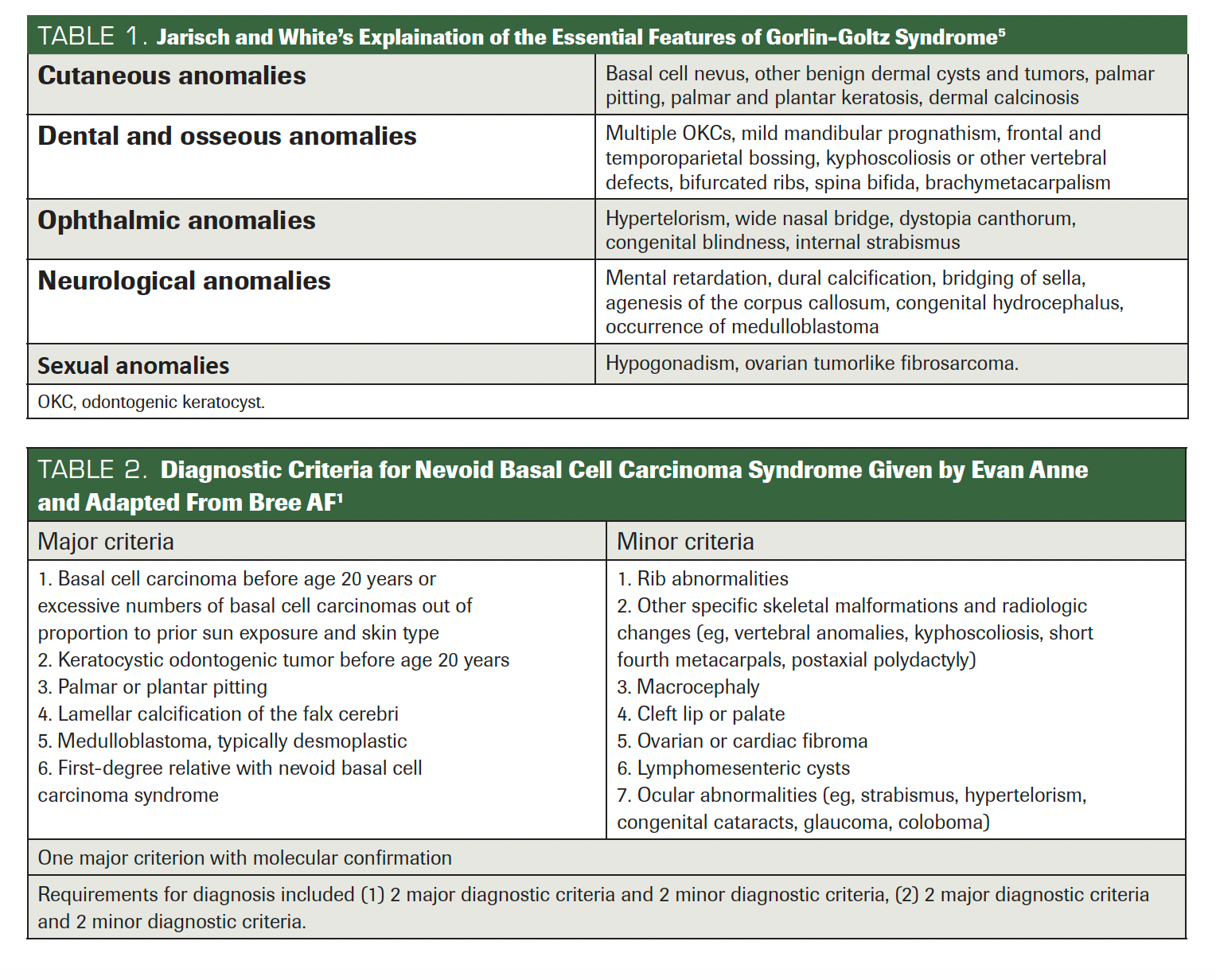 Since 1894, numerous criteria have been proposed to diagnose GGS. Initially, Jarisch and White outlined essential features and termed it NBCCS (Table 1).5 In 1960, Robert James Gorlin and William Goltz identified the classical triad (multiple basal cell epitheliomas, keratocysts in the jaws, and bifid ribs) that confirmed the syndrome’s diagnosis. Evans et al originally defined the diagnostic criteria for NBCCS in 1993, later reviewed by Manfredi et al. In 2011, Bree et al suggested that for a GGS diagnosis, a minimum of 2 major and 2 minor, or 1 major and 3 minor criteria, must be met. He also suggested confirming the syndrome with molecular investigations (Table 2).1 Rayner et al further refined the triad, asserting that for diagnosis, cysts should be present in combination with falx cerebri calcification or palmar/plantar pits.9 Kimonis et al in 1997 adjusted this to require either 2 major or 1 major and 3 minor criteria for diagnosis (Table 3).5,7-9 Presently, WHO recommends considering the diagnostic criteria for GGS if multiple basal cell carcinomas and/or OKCs occur before age 20 (Table 4).2,3