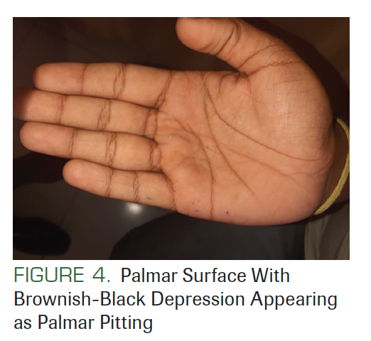 FIGURE 4. Palmar Surface With Brownish-Black Depression Appearing as Palmar Pitting