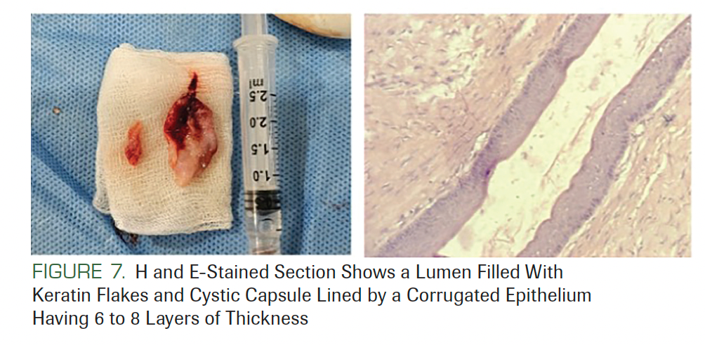 FIGURE 7. H and E-Stained Section Shows a Lumen Filled With Keratin Flakes and Cystic Capsule Lined by a Corrugated Epithelium Having 6 to 8 Layers of Thickness