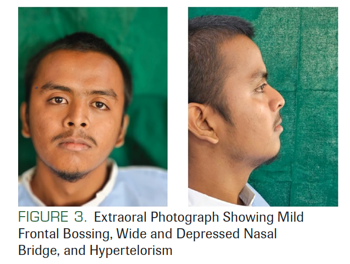 FIGURE 3. Extraoral Photograph Showing Mild Frontal Bossing, Wide and Depressed Nasal Bridge, and Hypertelorism