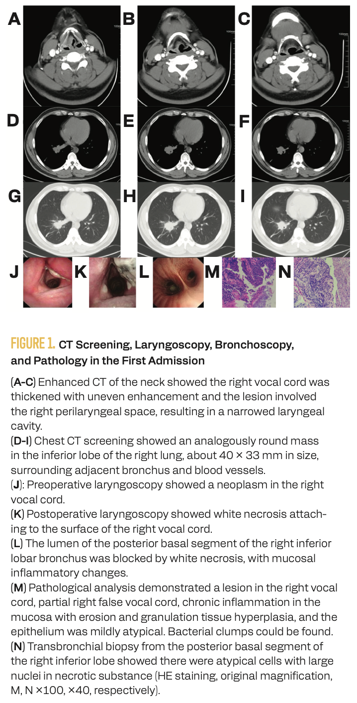 A 44-year-old man was admitted to the Affiliated Hospital of Qingdao University on October 24, 2020, due to “hoarseness of voice for more than 2 months.” Hoarseness initially appeared intermittently after the man drank alcohol and progressively worsened and became persistent. Electronic laryngoscopy revealed a right vocal cord tumor. The patient was healthy in the past and had no history of genetic predisposition to diseases. Physical examination did not reveal palpable superficial lymph nodes throughout the body, or enlarged liver and spleen. Peripheral blood tests of blood routine, liver and kidney function, electrolytes, thyroid tests, and male tumor markers showed no abnormalities. An enhanced CT scan of the neck indicated a space-occupying lesion on the right vocal cord and enlarged cervical lymph nodes (Figures 1A to 1C). The chest CT indicated an opacity in the right lung and slightly enlarged mediastinal lymph nodes (Figures 1D to 1I). Following the excision of the vocal cord lesion via suspension laryngoscopy, histopathological analysis demonstrated chronic inflammation in the mucosa with erosion and granulation tissue hyperplasia, and mildly atypical epithelium with bacterial clumps (Figures 1J to 1M). Bronchoscopy displayed white necrotic material adhering to the right vocal cord and obstructing the bronchial lumen of the posterior basal segment of the right lung. Transbronchial biopsy (TBB) from the posterior basal segment of the right inferior lobar bronchial mucosa showed atypical cells with large nuclei within the necrotic tissue (Figures 1L and 1N); however, it was difficult to make further diagnosis due to the low amount of tissue and severe necrosis (Figure 1). Subsequently, the patient was discharged.