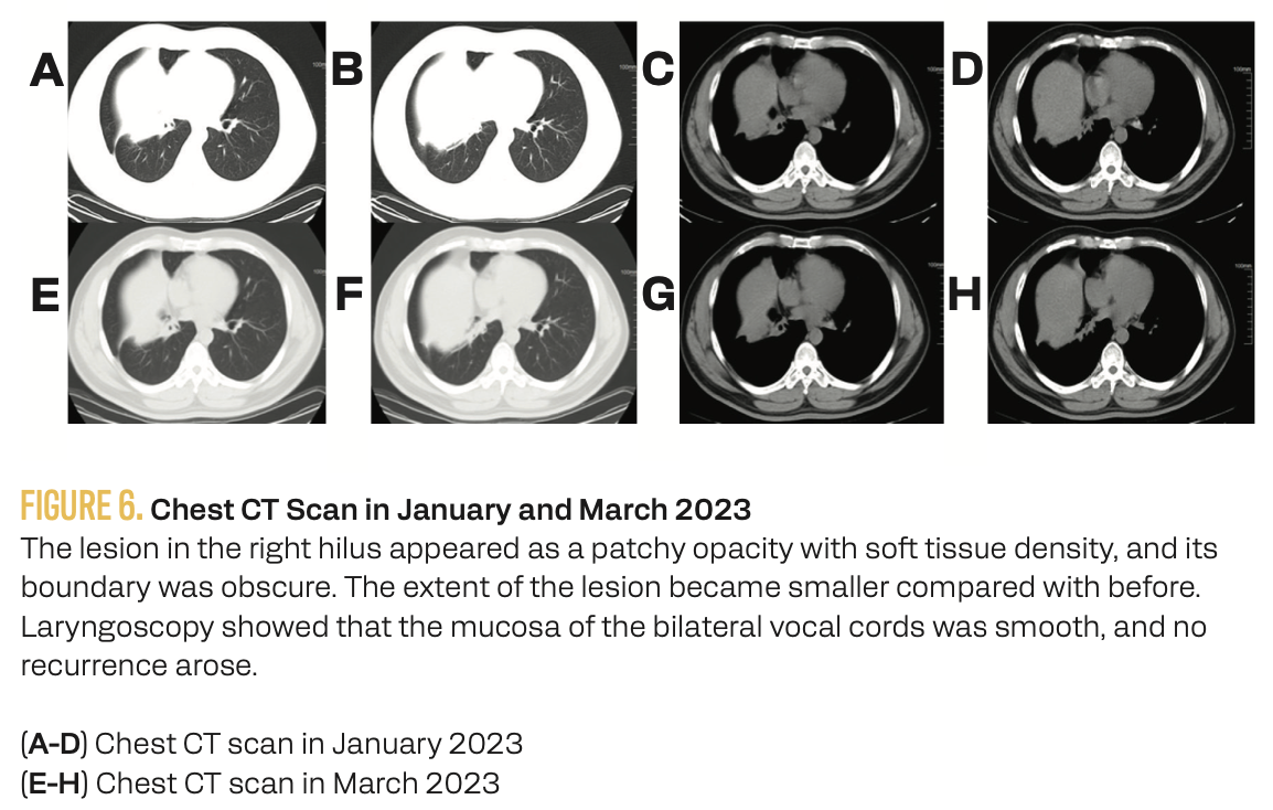 Later on, the patient underwent immunotherapy combined with chemotherapy for 14 cycles from January 2021. The treatment regimen from first to eighth cycles was sintilimab (200 mg on day 1) plus P-GemOx (pegaspargase 2000 IU day 1 plus gemcitabine 1000 mg on days 1 and 8 plus oxaliplatin 125 mg on day 1). The treatment regimen from 8th to 14th cycles was sintilimab (200 mg on day 1) plus chidamide (30 mg twice a week, and the dose was reduced to 15 mg from the 10th cycle). Sintilimab was applied every 3 months, and the dosage of chidamide was gradually reduced to 10 mg twice weekly. Periodic examination of whole blood EBV DNA load during the process of treatment revealed that it had been transiently elevated in November 2021 and December 2021, with exact values of 2.55 E+003 and 2.45E+002, respectively. Additionally, serum lactate dehydrogenase values were examined regularly during treatment and dropped to normal levels. Chest CT conducted in January and March 2023 indicated a remarkable reduction in the space-occupying lesion in the right lung and enlarged mediastinal lymph nodes (Figure 6). Upper abdomen, lower abdomen, and pelvis CT showed no discernible abnormalities or signs of recurrence.