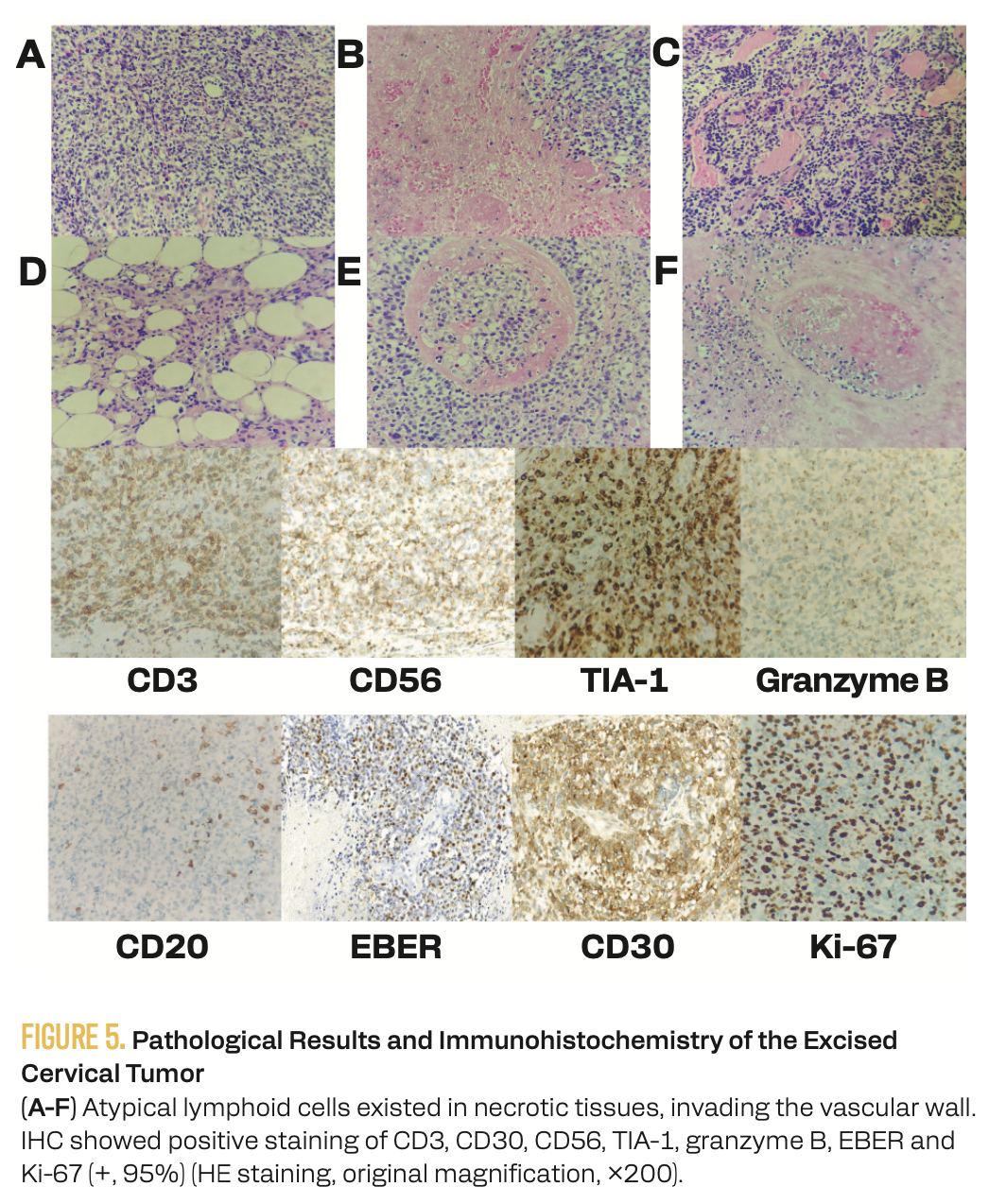 However, EBV DNA load in the whole blood was below the lower limit of detection, indicating that the patient might have been previously infected with EBV. Enhanced chest CT illustrated the progression of the right hilar space–occupying lesion (Figure 4). In view of the inadequate effect of previous anti-infective treatment, the application of antibacterial agents was halted. Subsequently, on December 24, 2020, right neck exploratory surgery and cervical tumor resection were performed. Pathology showed atypical lymphoid cells within areas of necrosis invading the vascular wall (Figures 5A to 5F). Immunohistochemistry (IHC) showed positive staining for CD3, CD30, CD56, TIA-1, and granzyme B, and negative staining for CD5, CD10, CD20, CD21, CD23, CD45RA, CD138, ALK (SP8), PAX5, and TDT. The Ki-67 hot spot region in the cells had a positive rate of 95%. Additionally, EBV-encoded small nuclear RNA (EBER) in situ hybridization was positive (Figure 5). The immunophenotypes were consistent with the diagnosis of ENKTL. The lesion in the right lung was considered to be of the same diagnosis. Bone marrow aspiration showed no tumor cell involvement. The patient was finally diagnosed as ENKTL, stage IV, with a nomogram-revised risk index (NRI) of 4 and a prognostic index of natural killer lymphoma (PINK) of 3.