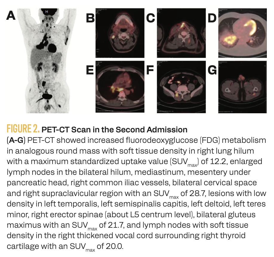 Autoantibodies such as extractable nuclear antigen (ENA), antinuclear antibodies (ANAs), antineutrophil cytoplasmic antibodies (ANCAs), and anticyclic citrullinated peptide antibody were negative. Given the presence of bacterial clumps in the biopsy obtained via laryngoscopy and that the patient had not previously received prior anti-infective therapy, moxifloxacin (400 mg once daily) was administered for 1 week (from November 6 to November 12, 2020). At the same time, a PET-CT scan was performed, and revealed the involvement of multiple systems and organs, suggesting the possibility of lymphoma, extensive metastasis of malignant tumors, or inflammatory diseases, such as tuberculosis (Figure 2). Pathological results from electronic bronchoscopy (TBB from the right inferior lobe) demonstrated a large number of necrotic and inflammatory exudates, with only a few bronchial mucosal tissues displaying chronic active inflammation (Figures 3A and 3B). Cells with large and hyperchromatic nuclei were found in the bronchoalveolar lavage fluid (BALF) of the inferior lobe of the right lung. A series of special stains, such as acid-fast bacteria staining, Grocott-Gomori methenamine-silver staining, mucicarmine staining, Gram staining, and periodic acid Schiff (PAS) staining, all yielded negative results. Next-generation sequencing (NGS) of BALF indicated Streptococcus constellatus. Hence, based on the bacterial susceptibility test, the patient was treated with piperacillin-tazobactam (4.5 g every 8 hours) in combination with moxifloxacin (400 mg once daily) for 5 days (from November 13 to November 17) and was discharged on November 18, 2020.