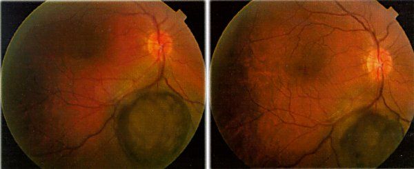 In the left image, a collar-button shaped choroidal melanoma is seen at lower right. Note the wrinkles in the macular retina caused by tumor growth. At right, after palladium-103 plaque radiation therapy, the choroidal melanoma appears darker and smaller as evidenced by resolution of the macular retinal folds. These photographs of this rare ocular cancer are from the extensive collection of NYU ophthalmologist Paul T. Finger, MD. More ocular images can be seen on the Eye Cancer Network (www.eyecancer.com).