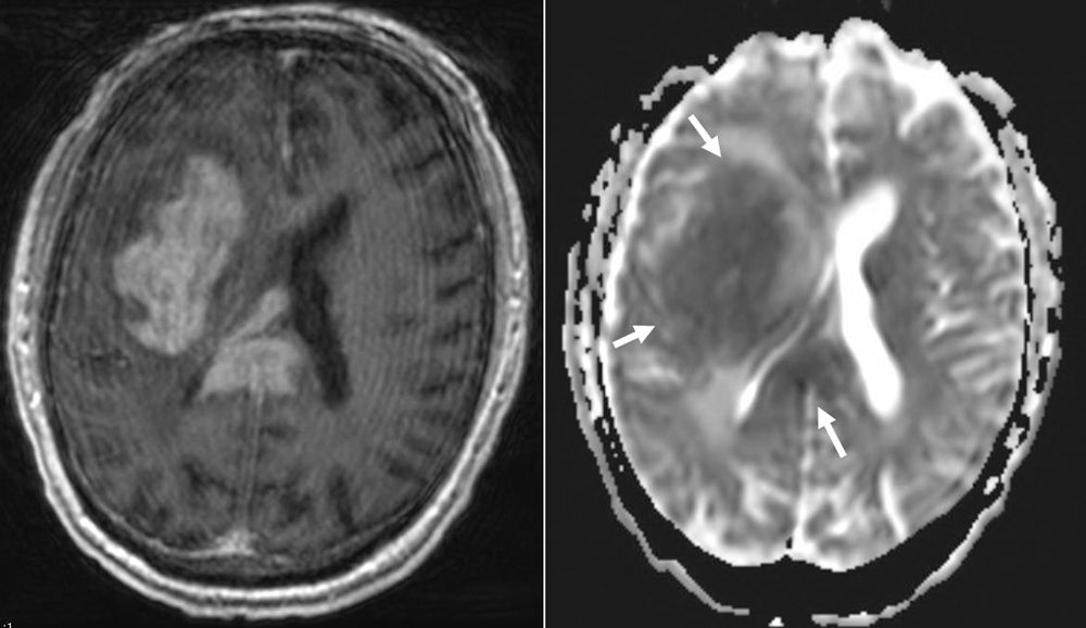 A 74-year-old, right-handed man with a medical history of hypertension, hyperlipidemia, and type 2 diabetes mellitus was found lying on the ground by his family and was brought to the emergency department, where he was found to have left facial drooping and weakness. On admission, a T1 post-contrast axial MRI and apparent diffusion coefficient diffusion-weighted imaging were performed.