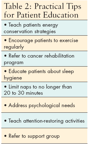 This case illustrates ongoing challenges of long-term cancer- related fatigue experienced by survivors. Beatrice’s health-care team did a comprehensive workup of treatable causes of fatigue, including a focused history and an in-depth assessment of other treatable contributing factors. Recurrence was ruled out, current medications were ruled out, and her blood work was within normal limits. Factors identified as contributing to Beatrice’s fatigue were prolonged inactivity, altered sleep patterns, weight gain, and emotional distress. Table 2 provides some practical tips for patient education.