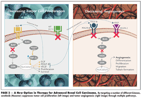 "Nexavar is an oral anticancer drug that blocks tumor growth in new ways," said Arthur Higgins, chairman of Bayer Healthcare's executive committee. In preclinical models, Nexavar was shown to target members of classes of kinases known to be involved in both tumor cell proliferation and tumor angiogenesis. These kinases include RAF kinase, VEGFR-2, VEGFR-3, PDGFR-?, KIT, and FLT-3.