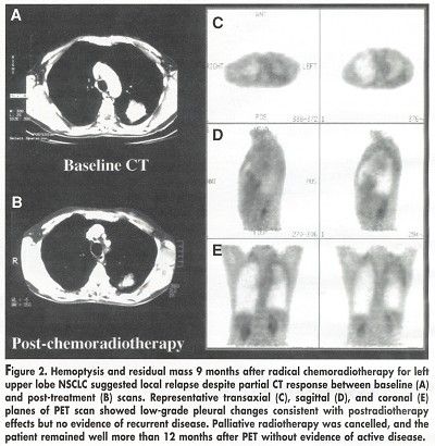 The second trial of F-18-FDG PET involved 63 consecutive NSCLC patients with suspected relapse more than 6 months after definitive treatment. The researchers compared the apparent extent of disease on conventional restaging with that on FDG-PET. In order to validate diagnostic findings, serial imaging and pathologic results were obtained during a median follow-up of 19 months.