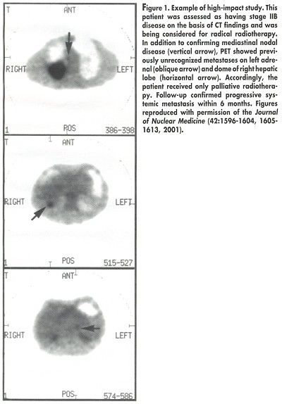 For 153 consecutive patients with newly diagnosed NSCLC, the researchers compared the treatment plan based on conventional staging methods with the treatment plan based on incorporation of PET findings. The results showed that 10% of cases were downstaged and 33% were upstaged by inclusion of PET.