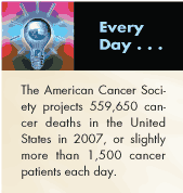 The report also included projections for 2007, with an estimated 1.44 millon new invasive cancer diagnoses. Cancer deaths are expected to total 559,650 in 2007, with the big four (lung, prostate, breast, and colorectal) accounting for slightly more than 50% of the total.