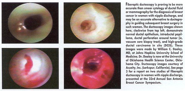 SAN ANTONIOBy inserting a thin, hollow fiberoptic ductoscope through breast ducts in the nipple, physicians can examine the ductal system of the breast and accurately locate ductal lesions (see images).