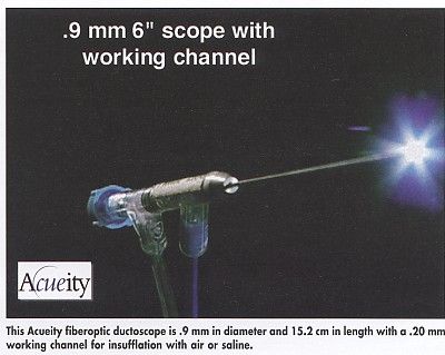 The Acueity system used in this study consists of a viewing screen and a 1.2 mm rigid microendoscope that houses a .08 mm optical channel and a .35 mm working channel for irrigation and introduction of therapeutic tools. The company also now manufacturers a .9 mm rigid scope with a .20 mm working channel (see Figure).