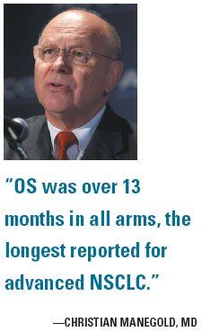 No differences were observed in overall survival. However, “OS was remarkably long in all arms, over 13 months, which is the longest reported for advanced NSCLC,” Dr. Manegold said.
