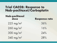 • CA028, a European-Asian open-label dose-escalation four-cohort study of combination therapy with nab-paclitaxel/carboplatin in chemonaive stage IIIB/IV NSCLC, was initiated in March 2005 and is closed to accrual. A total of 100 patients (25 in each cohort) have been enrolled. All patients received carboplatin to AUC 6 every 3 weeks. In each of four cohorts, patients received a different dose of nab-paclitaxel: 225, 260, 300, or 340 mg/m2.