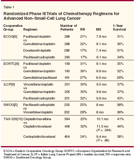 With best supportive care alone, patients with metastatic non-small-cell lung cancer (NSCLC) have a median survival of 4 to 5 months and 1-year survival rates of approximately 10%.[1] Metastatic NSCLC: Chemotherapy Trials carried out in the 1980s and 1990s comparing chemotherapy to best supportive care reported variable efficacy results; however, a pivotal meta-analysis of these data indicated that cisplatin-based chemotherapy provided a survival benefit in advanced NSCLC.[2] The meta-analysis included eight trials involving 778 patients who received cisplatin-based chemotherapy vs best supportive care. The hazard ratio for death was 0.73 in favor of chemotherapy (P < .0001). This equated to a 1.5-month increase in median survival and a 10% increase in survival at 1 year. Chemotherapy for patients with advanced disease has also demonstrated that it can improve a patient's quality of life and be costeffective.[ 3,4] In the past decade newer agents such as gemcitabine (Gemzar), vinorelbine, paclitaxel, and docetaxel(Taxotere) have all demonstrated activity in NSCLC as single agents; consequently, these agents have been combined with cisplatin or carboplatin. Randomized phase III trials have endeavored to identify an optimal platinum- based doublet therapy regimen. Phase III Trials