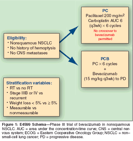 40. Sandler AB, Gray R, Brahmer J, et al: Randomized phase II/III trial of paclitaxel (P) plus carboplatin (C) with or without bevacizumab (NSC #704865) in patients with advanced non-squamous non-small cell lung cancer (NSCLC): An Eastern Cooperative Oncology Group (ECOG) Trial-E4599 (abstract 4). J Clin Oncol 23(suppl 16S):2s, 2005.
