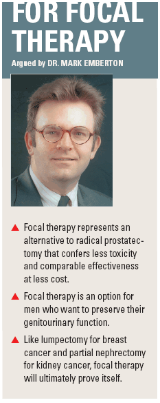 Focal therapy represents a major advancement in prostate cancer treatment, Dr. Emberton said. The therapy is controversial now but so was lumpectomy for breast cancer and partial nephrectomy for kidney cancer at one time, he added.