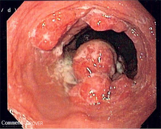 Endoscopic image of an esophageal adenocarcinoma seen at the gastroesophageal junction; source: Montek, Wikimedia Commons